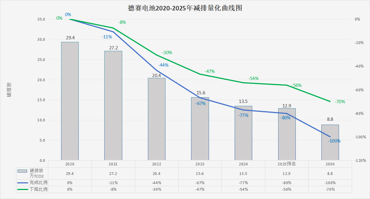 2020年德賽電池(仲愷工業園)的范圍1、2、3碳排放總量約為29.4萬噸,德賽電池通過不懈努力,僅至2024年,公司已成功將碳排放總量削減至約13.5萬噸(已完成77%的目標),實現相對于基準年碳排放總量54%的顯著減排,2025年預計碳排總量約為12.9萬噸(預計完成80%的目標),實現相對于基準年碳排放總量56%的顯著減排。