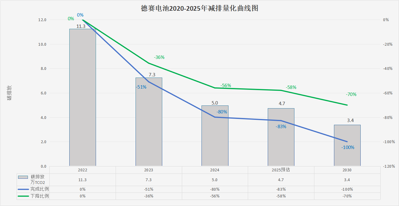 2022年德賽電池(惠南工業園)的范圍1、2、3碳排放總量約為11.3萬噸,德賽電池通過不懈努力,僅至2024年,公司已成功將碳排放總量削減至約5.0萬噸(已完成80%的目標),實現相對于基準年碳排放總量56%的顯著減排,2025年預計碳排總量約為4.7萬噸(預計完成83%的目標),實現相對